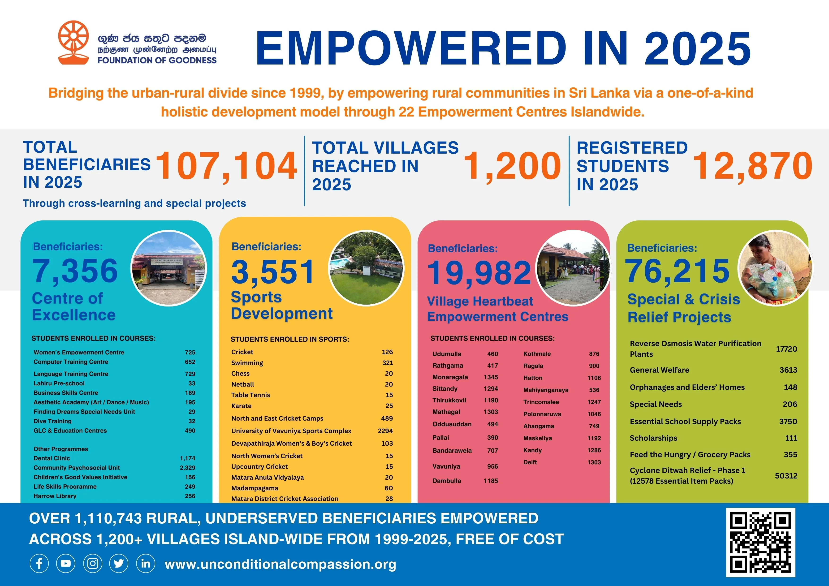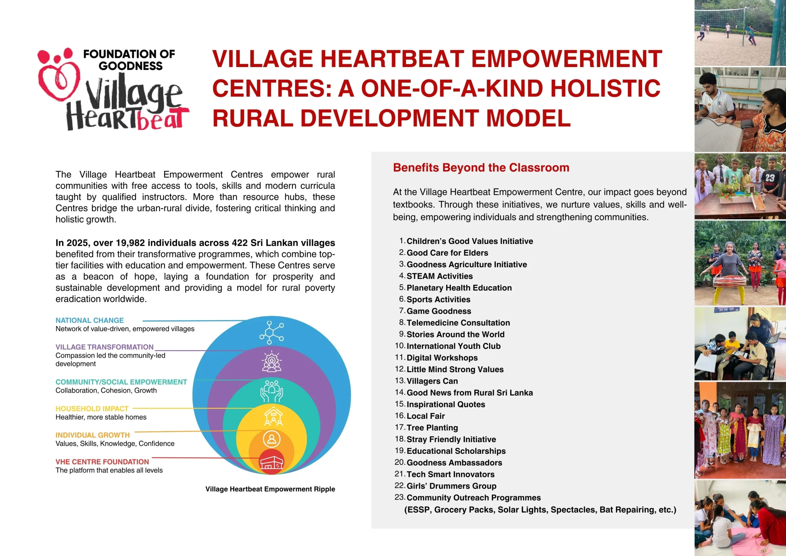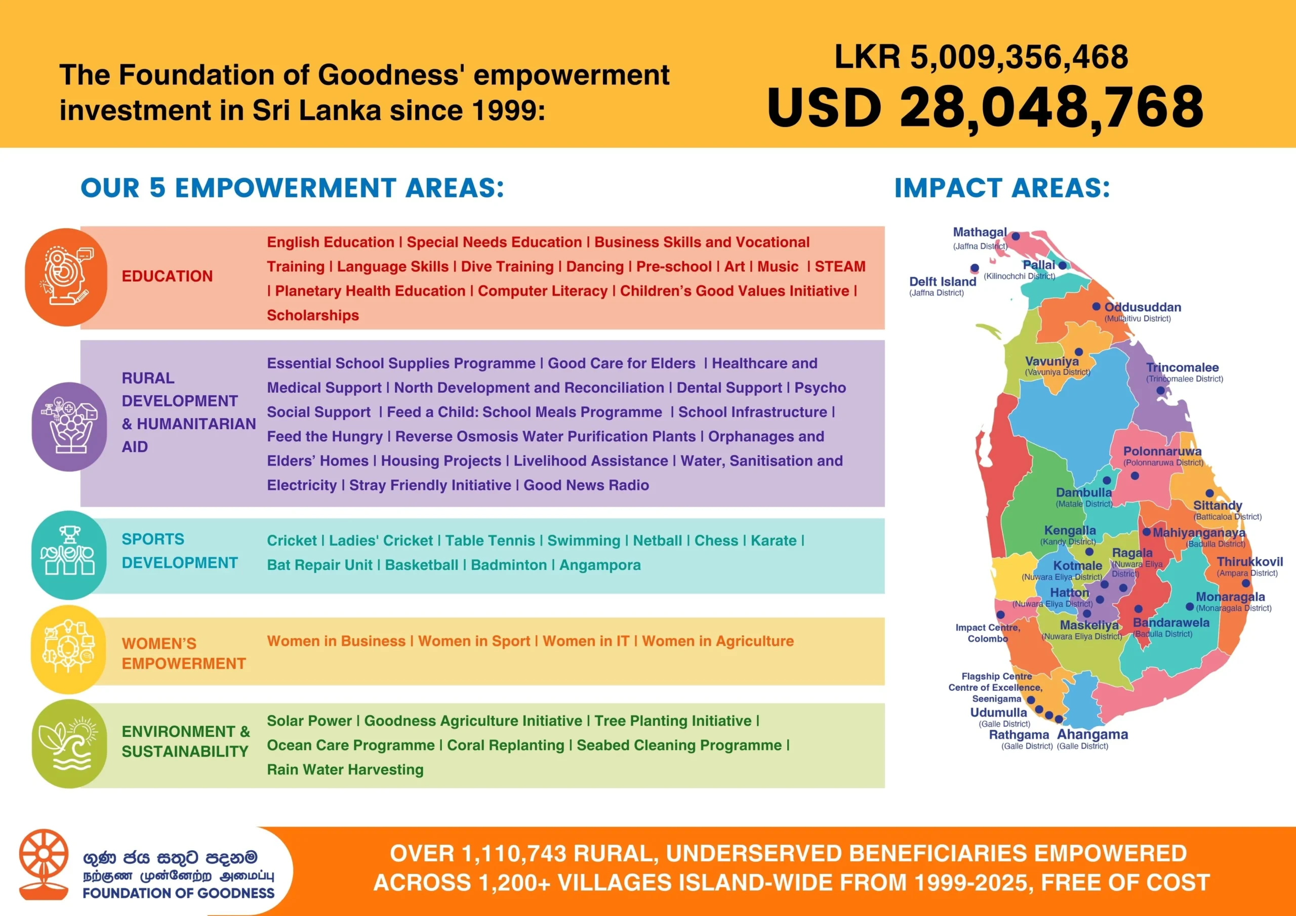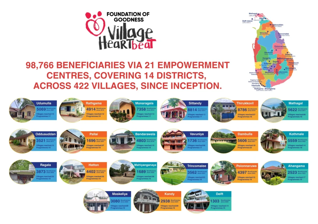 The Foundation of Goodness is a holistic rural development model that seeks to bridge the urban-rural divide in Sri Lanka via 10 empowerment divisions across 900+ villages island-wide, and reached over 307,000+ beneficiaries in 2022 alone by way of 15 Empowerment Centres, free of cost.