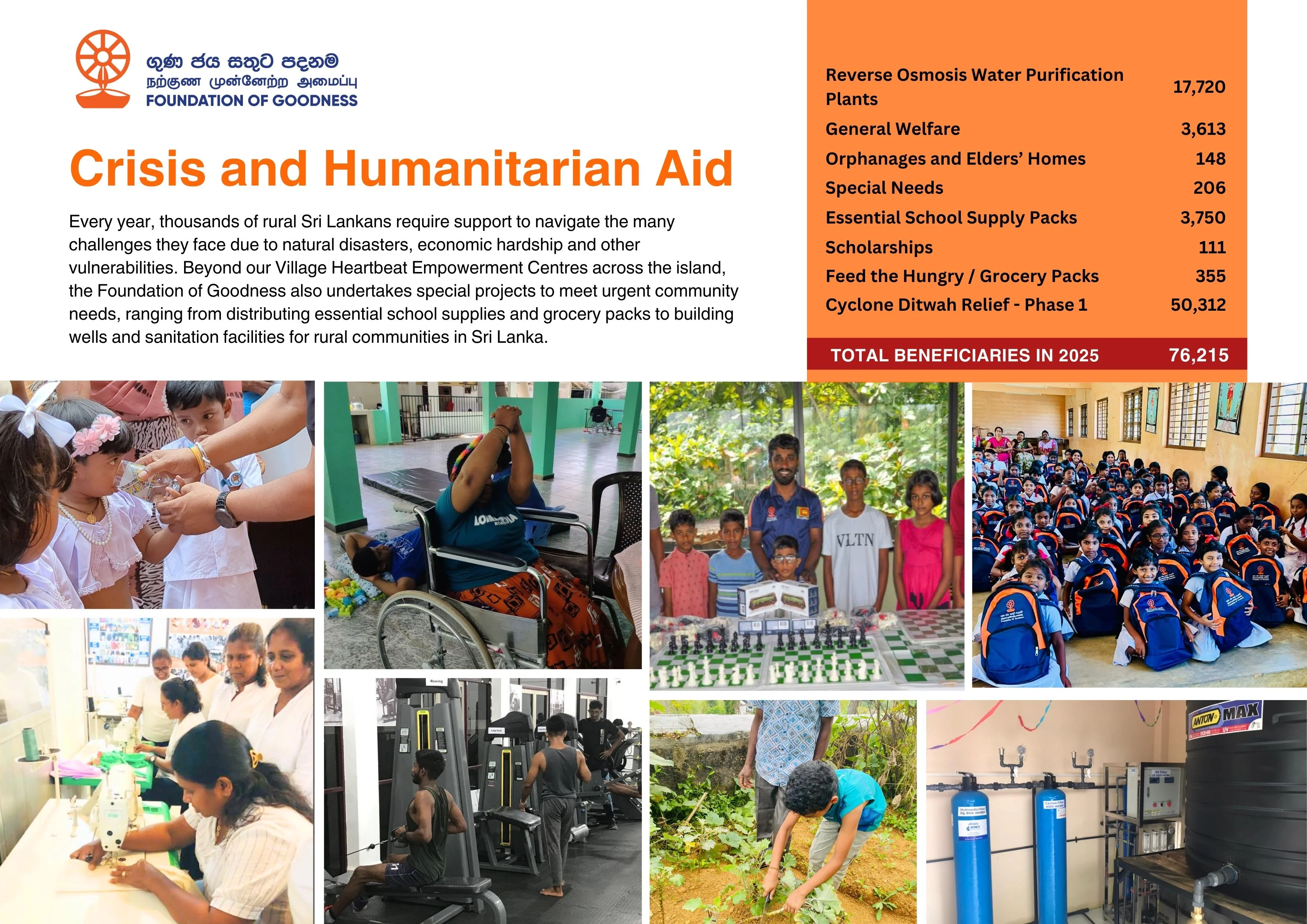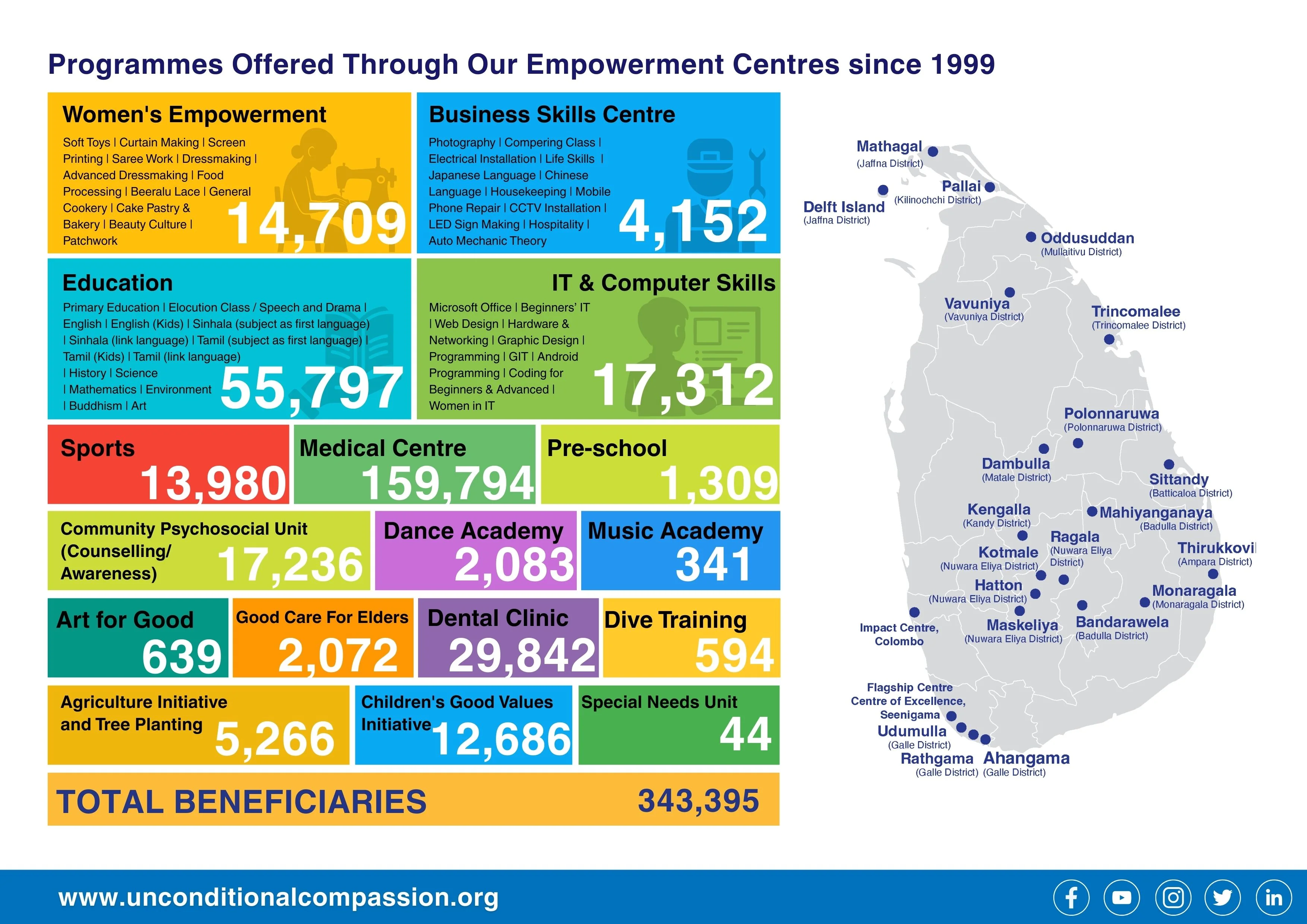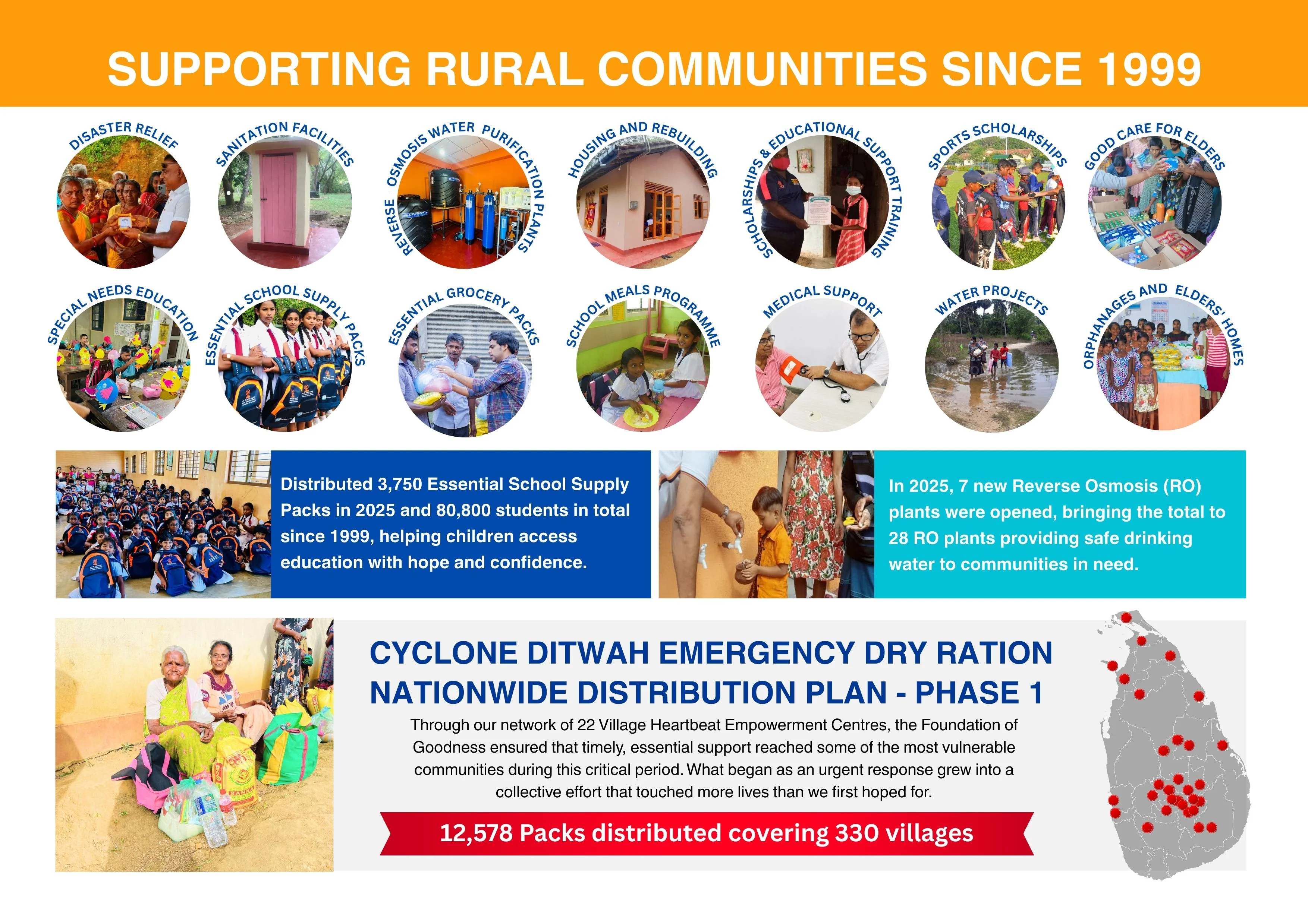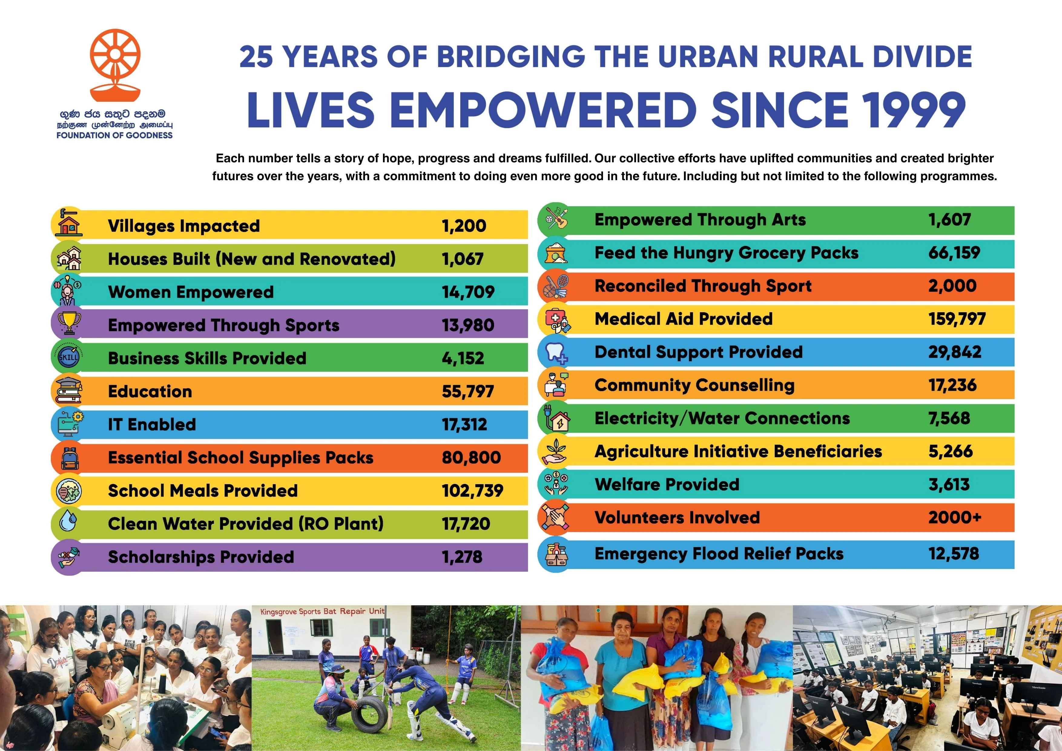 The Foundation of Goodness is a holistic rural development model that seeks to bridge the urban-rural divide in Sri Lanka via 10 empowerment divisions across 900+ villages island-wide, and reached over 307,000+ beneficiaries in 2022 alone by way of 15 Empowerment Centres, free of cost.
